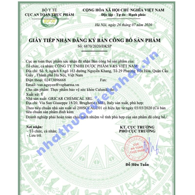 Khi mua sản phẩm bổ sung, người tiêu dùng cần kiểm tra kỹ thông tin pháp lý và xuất xứ để đảm bảo an toàn. Calumik chính hãng đã được cấp: