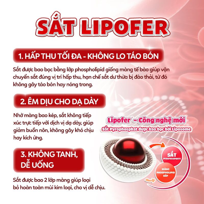 | Công Nghệ | Sắt sinh học Liposome (Vi bao). Sắt được bao bọc trong màng lipid kép. | Sắt sinh học Liposome (Vi bao). Sắt được bao bọc trong màng lipid. | Sắt hữu cơ (Thế hệ 2). Là một dạng muối sắt hữu cơ truyền thống. |
