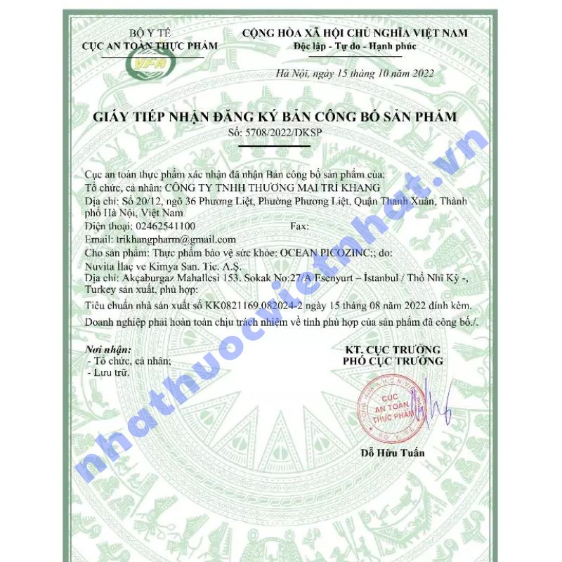 Để đảm bảo mua đúng sản phẩm chính hãng và an toàn, người tiêu dùng cần kiểm tra kỹ các thông tin pháp lý liên quan. Ocean Picozinc đã được Cục An toàn Thực phẩm - Bộ Y tế cấp giấy xác nhận công bố tại Việt Nam: