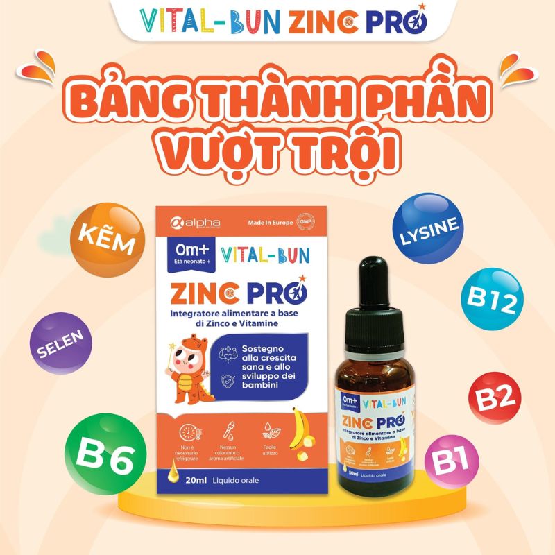 Với công thức chứa kẽm bisglycinate thế hệ mới cùng Lysine, Selen và vitamin nhóm B (B1, B2, B6, B12), sản phẩm giúp cải thiện vị giác, kích thích cảm giác ngon miệng và tăng cường khả năng hấp thu dinh dưỡng. Đồng thời, Vital-Bun Zinc Pro còn hỗ trợ tăng cường hệ miễn dịch, giảm thiểu tình trạng ốm vặt và bảo vệ cơ thể khỏi các tác nhân gây bệnh.