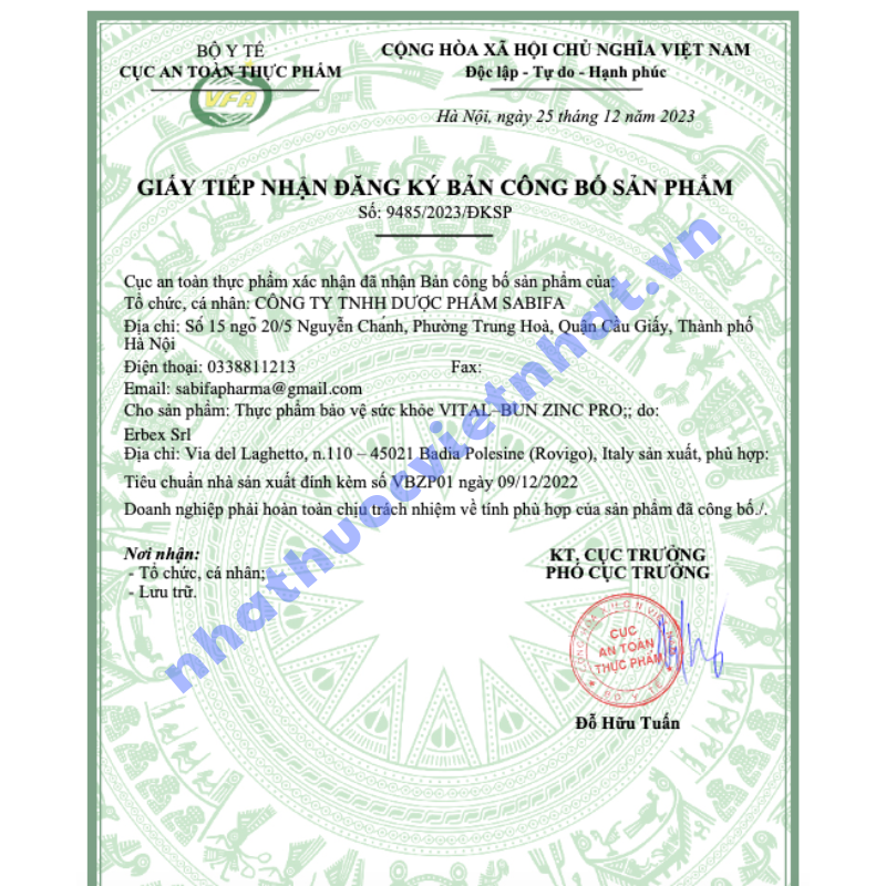 Khi mua sản phẩm bổ sung kẽm cho trẻ, phụ huynh cần kiểm tra kỹ thông tin pháp lý và xuất xứ để đảm bảo an toàn. Vital-Bun Zinc Pro chính hãng đã được cấp:
