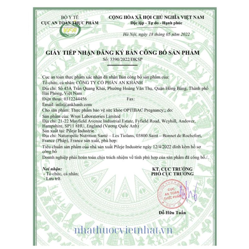 Khi mua sản phẩm bổ sung, người tiêu dùng cần kiểm tra kỹ thông tin pháp lý và xuất xứ để đảm bảo an toàn. Optibac Pregnancy chính hãng đã được cấp: