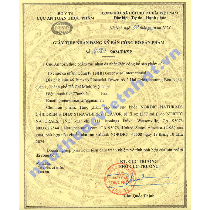 Khi mua sản phẩm, cần kiểm tra kỹ thông tin pháp lý và xuất xứ để đảm bảo an toàn. Nordic Naturals Children's DHA chính hãng đã được cấp: