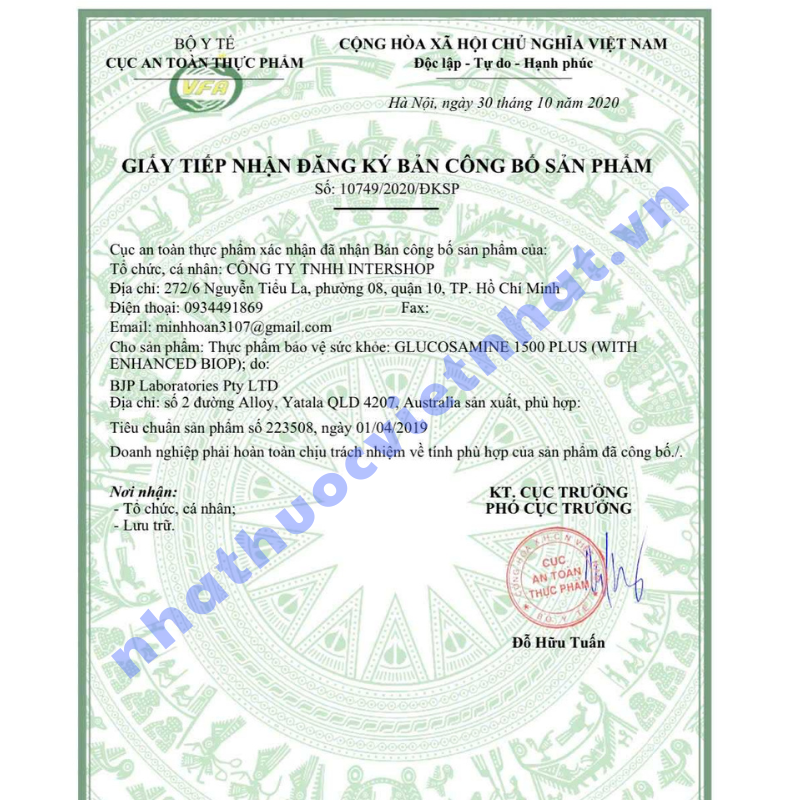 Khi mua sản phẩm, cần kiểm tra kỹ thông tin pháp lý và xuất xứ để đảm bảo an toàn. GLUCOSAMINE 1500 PLUS (WITH ENHANCED BIOP) chính hãng đã được cấp:
