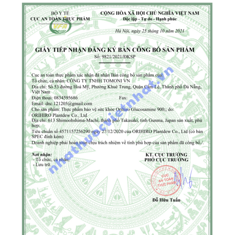 Khi mua sản phẩm bổ sung cho khớp, người tiêu dùng cần kiểm tra kỹ thông tin pháp lý và xuất xứ để đảm bảo an toàn. Orihiro Glucosamine 900 chính hãng đã được cấp: