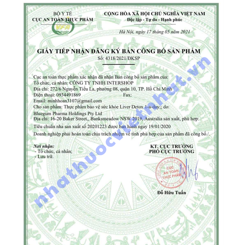 Để đảm bảo mua đúng sản phẩm chính hãng và an toàn, người tiêu dùng cần kiểm tra kỹ các thông tin pháp lý liên quan. Sản phẩm Liver Detox 1-a-day đã được Cục An toàn Thực phẩm - Bộ Y tế cấp giấy xác nhận công bố: