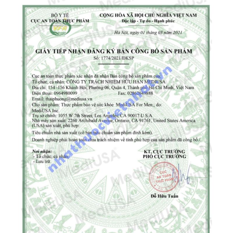 Khi mua sản phẩm bổ sung, người tiêu dùng cần kiểm tra kỹ thông tin pháp lý và xuất xứ để đảm bảo an toàn. MediUSA For Men chính hãng đã được cấp: