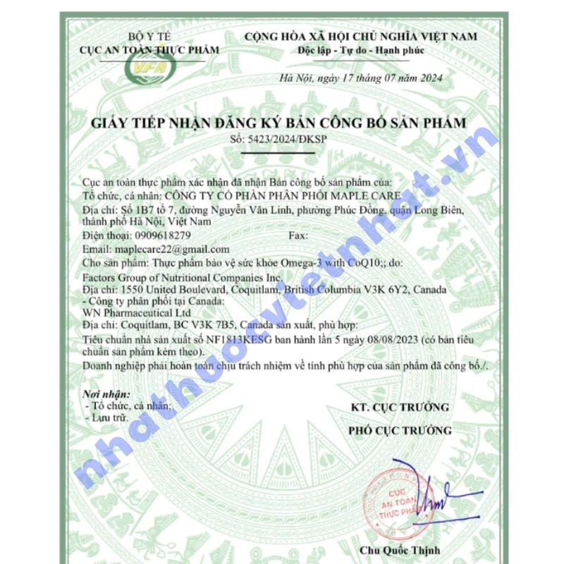 Để đảm bảo mua đúng sản phẩm chính hãng và an toàn, người tiêu dùng cần kiểm tra kỹ các thông tin pháp lý liên quan. Webber Naturals Omega 3 + CoQ10, thực phẩm chức năng kết hợp Omega-3 và Coenzyme Q10 giúp hỗ trợ sức khỏe tim mạch. Sản phẩm đã được Cục An toàn Thực phẩm - Bộ Y tế cấp giấy xác nhận công bố tại Việt Nam: