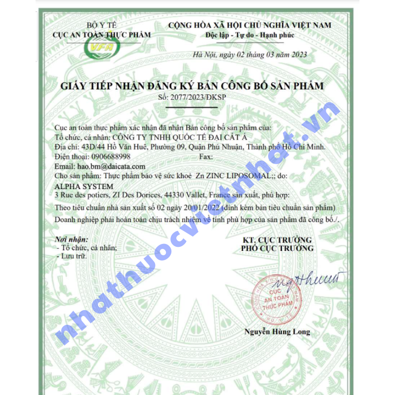 Chúng tôi cam kết cung cấp sản phẩm Zn Zinc Liposomal chính hãng 100%, được nhập khẩu trực tiếp từ Pháp thông qua CÔNG TY TNHH QUỐC TẾ ĐẠI CÁT A, đảm bảo nguồn gốc rõ ràng và chất lượng tốt nhất cho sức khỏe của quý khách.